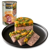 Holistisk fuldfoder dåsemad til voksne hunde med indhold af andekød og indmad i for af kråse, hjerte, lever.