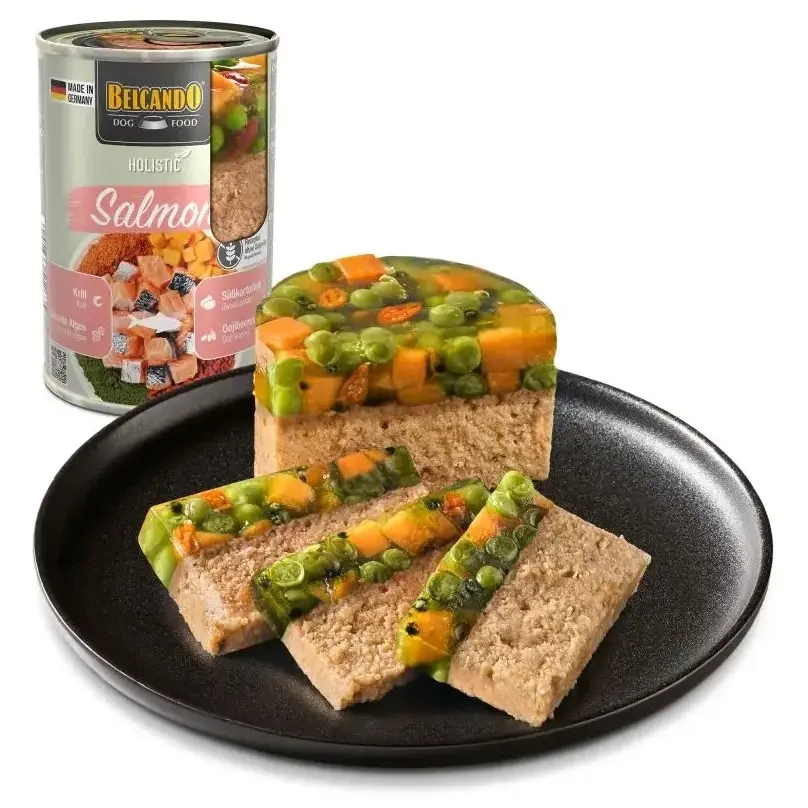 Holistisk fuldfoder dåsemad til hunde med indhold af laksekød.