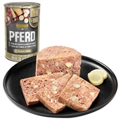 Fuldfoder dåsemad med indhold af hestekød og indmad i form af hjerte, mave, lever, lunge.
